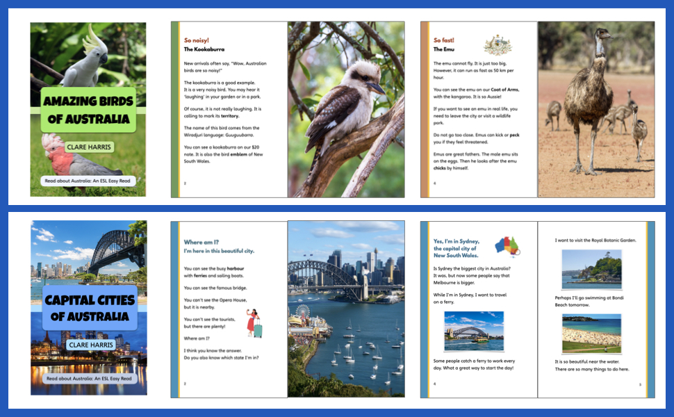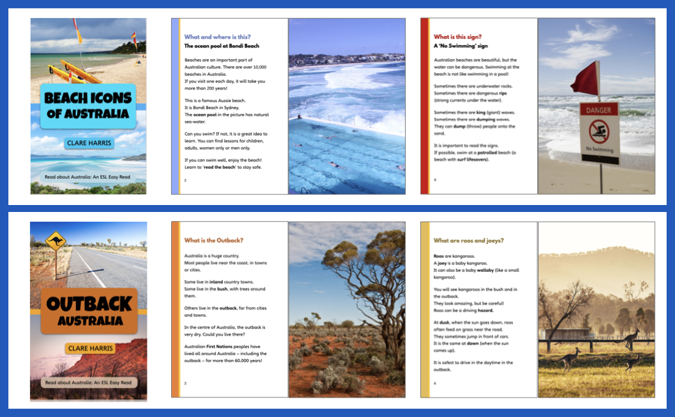 The Read about Australia non-fiction series is aimed at elementary level / post-beginner learners (or beginners with strong reading and vocabulary skills). You’ll see that the pages have a ‘literacy’ look, as I was thinking of the many learners I’ve met with limited formal education, and those who have had to adjust to reading in a new script and perhaps in a new direction.